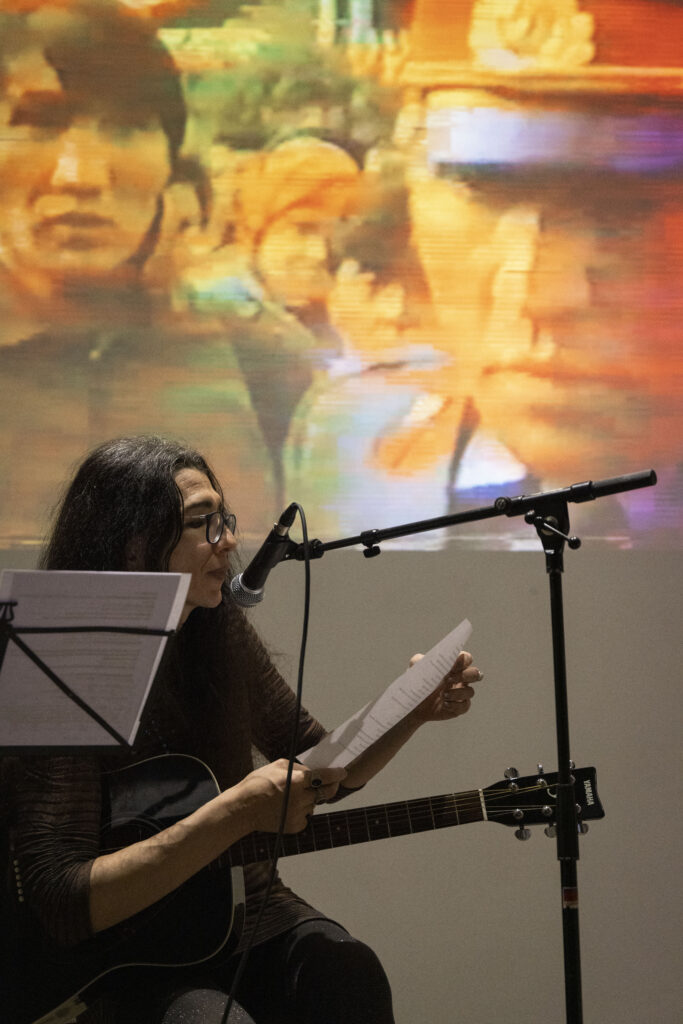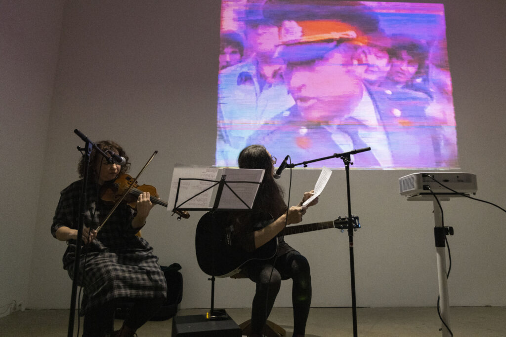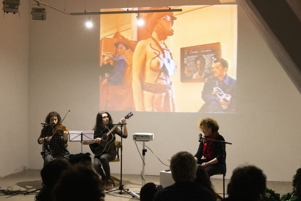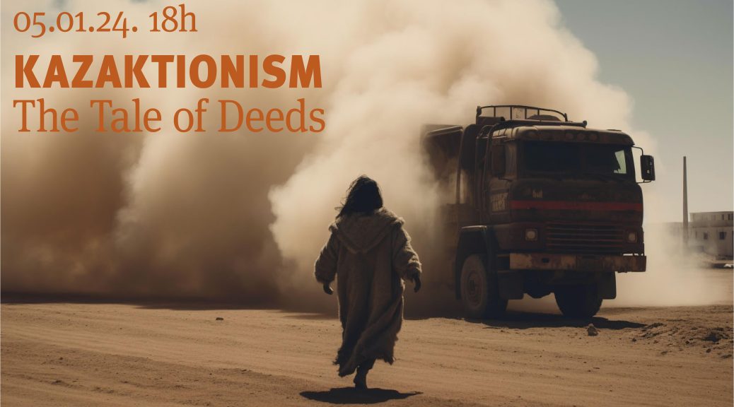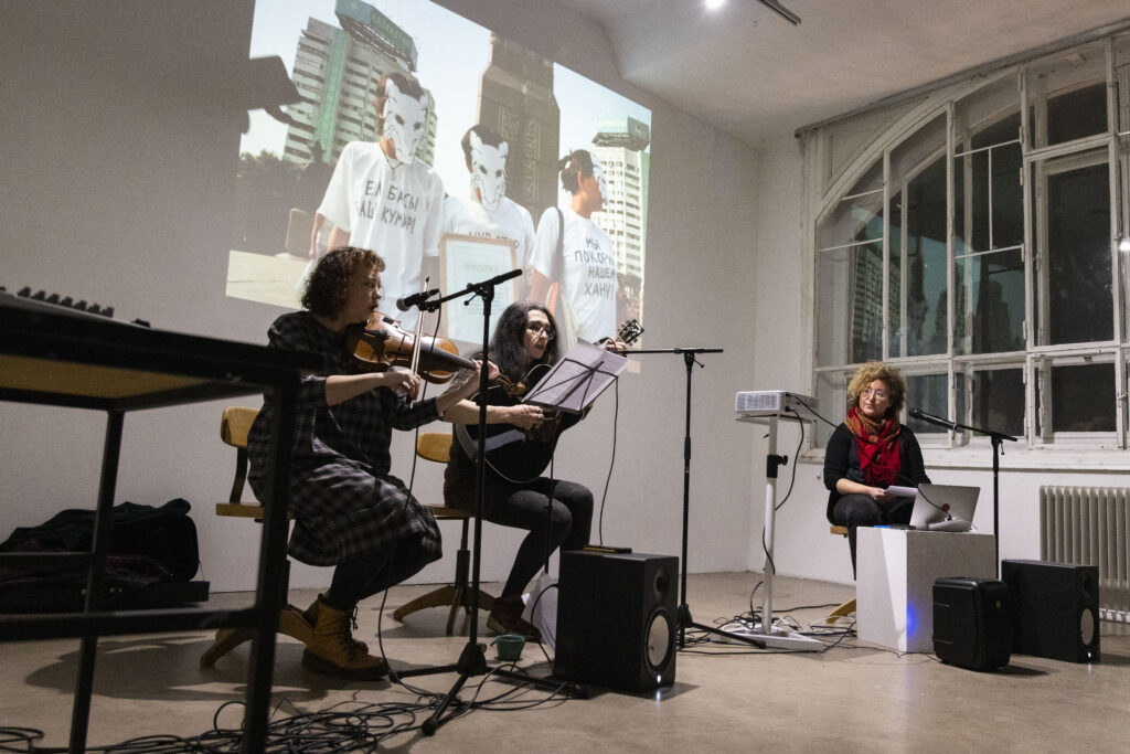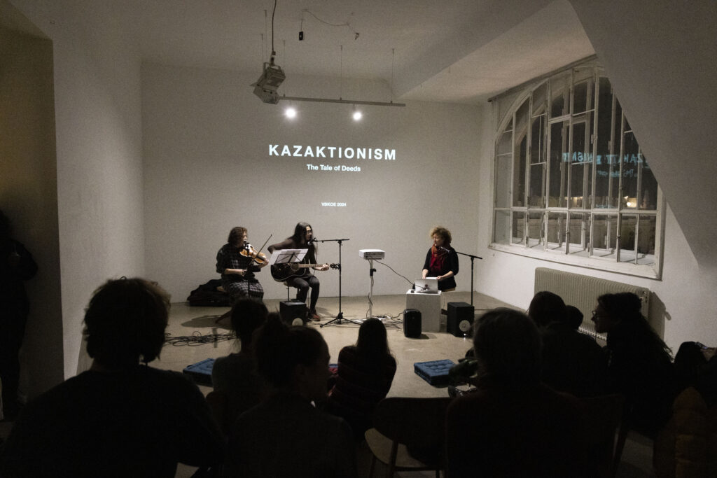 ‘The Tale of Deeds’ is a lecture and musical recitation representing a selection of public actions from recent Kazakhstani history. Performers sit between the audience and the slideshow projected on the wall behind them. One by another, they recite “The Tale of Deeds”, reading the text and singing it in a chanting manner. The narrative is composed a list of short descriptions of various public actions which have taken place in Kazakhstan (mostly in Almaty) over the past few decades. This list combines artistic performances with political actions undertaken by individuals as well as collectives. Each action from the list is illustrated by a slide or a short video clip. Part of these actions belong to the history of Kazakhstani performance art, part of them constitute a recent history of civil resistance and political protest against authoritarian rule. Presented in this way, these short descriptions of actions become a quasi-poetic recitation eulogizing various forms of civic consciousness, which have been emerging in Kazakhstan in the form of public performances and contributing to the ongoing transformations of Kazakh identity.